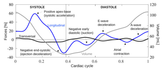 Typical time evolution of left ventricular hemodynamic forces over the cardiac cycle. The blue line shows apical-basal LV longitudinal forces, larger positive compared with transversal components (black line). Acceleration toward the base accounts for the systolic peak acceleration, after which deceleration causes the late systolic negative peak. Coinciding with the onset of diastole, another small negative early peak (suction) appeared, corresponding to early passive filling of the left ventricle (E-wave). A similar pattern was seen toward the end of diastole, corresponding to atrial contraction (A-wave). The grey line shows the LV volume over the cardiac cycle.