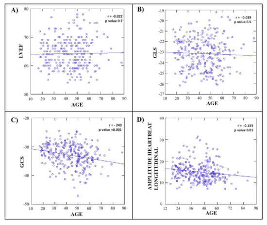 No significant correlation between left ventricular ejection fraction (LVEF) and GLS with age was found (r = −0.022 and r = −0.039, respectively, all p = ns). GCS showed a statistically significant correlation with age (r = −0.240; p < 0.001) (Figure 4).