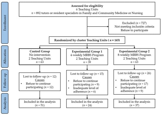 Every single one of the TUs analyzed was established as an independent cluster, and it was assigned randomly to the CG (2 TUs), the EG1 (2 TUs), or the EG2 (2 TUs). Participants’ selection was performed in each TU and was also stratified by type of participant (66 mentors and 66 resident intern specialists).