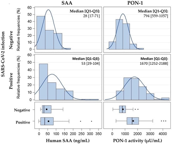 Distribution of SAA (ng/mL) and PON-1 activity (µU/mL) in 173 subjects. Data are presented as histograms and box-plots by SARS-CoV2 positivity. SAA, Serum amyloid A; PON-1, paraoxonase-1.