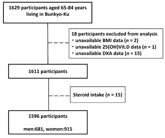 Of the 1629 participants enrolled in the Bunkyo Health Study, we excluded 18 with unavailable data (BMI [n = 2], 25-Hydroxyvitamin D [25(OH)D] (n = 1), DXA (n = 15)). Furthermore, of the remaining 1611 participants, 15 who received corticosteroids for each disease treatment were excluded as well. Finally, 1596 participants (male: 681, female: 915) were included in this analysis (Figure 1); subsequently, they were divided into four groups based on their exercise habits in adolescence and old age. We defined those who answered “yes” to the question “Did you participate in sports club activities when you were in junior high school or high school” as having exercise habits during adolescence, and we also asked them what types of school-based sports club activities they were involved in. On the other hand, those who responded “yes” to the question “Do you currently have exercise habits?” were described as having exercise habits in old age.