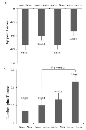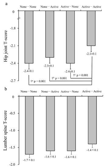 Comparison of the bone mineral density (T-score) between the four exercise groups in women. (a) Hip joint T-score; (b) lumbar spine T-score. Values are the means ± SE. † p < 0.05 for significant difference between groups; a: compared to the None-None group, b: compared to the None-Active group, c: compared to the Active-None group. Adjusted variables: Age, BMI, smoking history (current and past), alcohol intake, calcium intake, 25(OH)D, presence of diabetes, and taking osteoporosis drugs or estrogens.