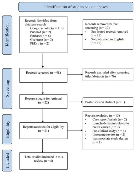 We searched PubMed, Embase databases, Physiotherapy Evidence Database (PEDro), Cochrane Library Databases, and Google Scholar for any relevant publications up until September 2021. Different combinations of the following keywords and MeSH terms were used in our initial literature search: “breast cancer”, “lymphedema”, “edema”, “ESWT”, and “shockwave”. Standard Boolean operators (AND, OR) were applied to link the terms, as shown in Table S1. The reference lists of selected articles were also hand-searched for additional related studies.