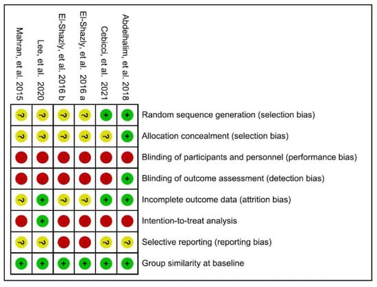 Cochrane risk of bias summary for the included articles. Mahran et al., 2015 []; Ely-Shazly et al., 2016 a [] b []; Abdelhalim et al., 2018 []; Lee et al., 2020 []; Cebicci et al., 2021 [].