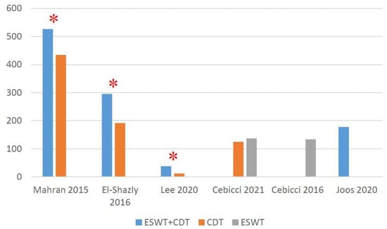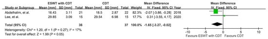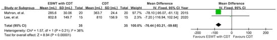 Three RCTs [,,] narrated the significant effectiveness of the additional ESWT when compared with CDT alone. One RCT [] showed the significant effect of both ESWT and CDT, although no significant intergroup difference was found. In the two prospective pilot studies, one [] showed the significant effect of ESWT, while the other [] revealed no significant effect of additional ESWT with CDT. The mean volume difference between baseline and post-treatment is shown in Figure 3.