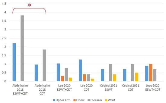 Three studies [,,] showed a significant skin-thickness reduction in the experimental group (ESWT plus CDT) compared to the control group (CDT only).