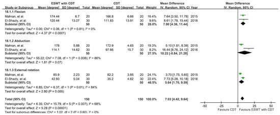 The results from two studies involving six groups [,] were analyzed to see the effects on both the experimental group (ESWT plus CDT) and control group (CDT alone) in improving shoulder joint ROM, as shown in Figure 7. The ROM of shoulder flexion, abduction, and external rotation were measured before and after the intervention.