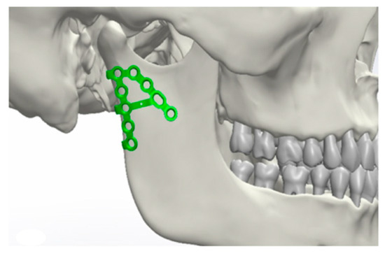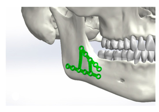 The design of the plates is critical for their clinical application. The design is based on observations on clinically used osteosynthesis plates for mandibular fractures. In the condyle, body, and symphysis area, the use of two plates is generally accepted [25,42]. In non-displaced simple fractures of the mandibular angle, the miniplate fixation on the oblique ridge according to Champy is the standard method. The Champy technique is a minimally invasive and fast method. In this case, a preformed plate would not be advantageous [43].