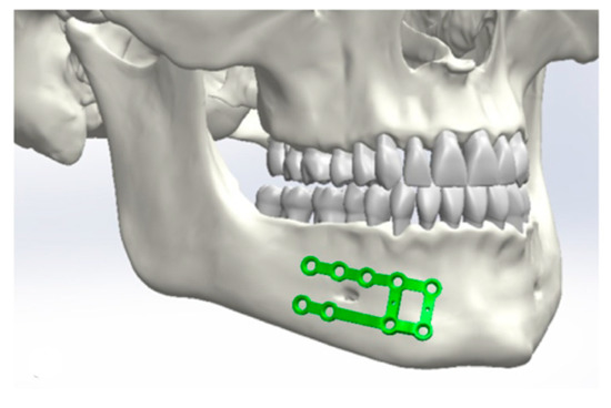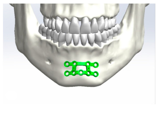 The shapes and sizes of the plates were designed according to the requirements of the AO Foundation. For simple linear fractures, the AO demands load-sharing osteosynthesis. A reduced buttress demands a more stable osteosynthesis. The most frequently applied technique in mandibular fractures is miniplate osteosynthesis combining two plates on the upper and lower border of the mandible. To compensate for the tensile and the compression strain, we in our department prefer the two-plate approach. The upper plate is located in the tension zone, and the lower plate is placed in the pressure zone [23,24,25]. Following this principle, the suggested plates have an upper and a lower part, stabilized by connectors, which enlarge the possible screw positions and increase the overall stability without increasing the thickness of the plates. The newly introduced plates are connected to each other to heighten the stability without increasing the thickness of the used plates, in order to avoid soft-tissue irritation. By the modified design with connected miniplates, the application range could be enlarged. The preformed plates fitted the strain occurring in the described regions during functioning. The basic elements of the plates are already in clinical use. The combination of two plates and an enlarged material cross-section increases the mechanical properties, for which reason a finite element analysis (FEA) was not required for product approval.