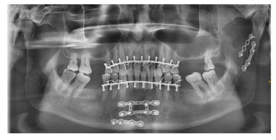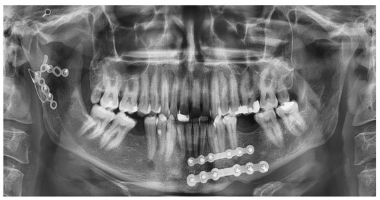 - Probst, F.A.; Mast, G.; Ermer, M.; Gutwald, R.; Schmelzeisen, R.; Pautke, C.; Otto, S.; Schiel, S.; Ehrenfeld, M.; Cornelius, C.-P.; et al. MatrixMANDIBLE preformed reconstruction plates—A two-year two-institution experience in 71 patients. J. Oral Maxillofac. Surg. 2012, 70, e657–e666. [Google Scholar] [CrossRef]
