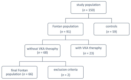 In this multicenter study (Krakow, Poznan, and Lodz in Poland), we studied 66 patients who received an FO operation without current vitamin K antagonist therapy out of a total of 91 FO adults, and 59 apparently healthy control subjects matched for age and sex. Clinical data and laboratory investigations were collected prospectively during the scheduled medical appointments, between January 2018 and December 2018. The exclusion criteria for FO patients were as follows: any acute illness, malignant neoplasms, serum creatinine level > 120 µmol/L, diabetes mellitus and alcohol abuse or pregnancy. Control subjects were eligible if they had no history of thromboembolic events (vein thrombosis, pulmonary embolism, or stroke), no signs of acute infection, recent trauma, or surgery. Pregnant women or those who delivered within the previous 12 months were also excluded (Figure 1).
