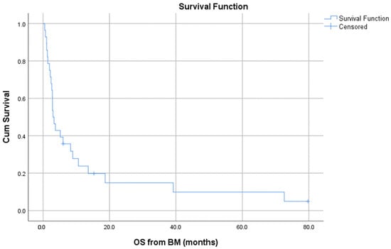 The median overall survival from brain metastasis diagnosis was 3 months (range, 0–80), as depicted in Figure 2. Six patients survived more than 1 year from brain metastasis diagnosis and three patients more than 3 years (long survivors).