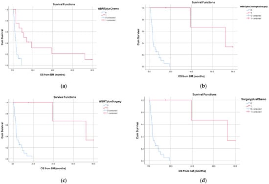 Overall survival (OS) from brain metastases according to combination therapy with (a) whole-brain radiation therapy (WBRT) + chemotherapy, (b) WBRT + chemotherapy + surgery, (c) WBRT + surgery and (d) surgery + chemotherapy.