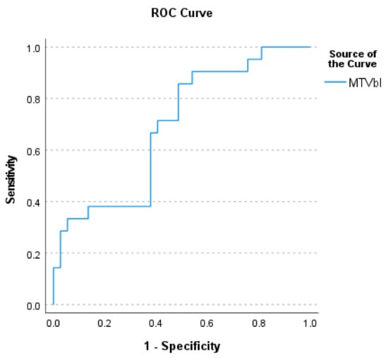 The median SUVmax value of the most active lesions in all patients was 11.7 (range: 3.5–29.7). The median MTV and TLG of all summed metabolic active lymphoma lesions were, respectively, 273.9 mL (range 1.1–1986.7 mL) and 1484.6 mlxSUV (range: 3.0–14,048.28 mlxSUV). Baseline MTV values of patients with complete metabolic results proved to be significantly lower than the values of patients with a partial metabolic response or a progressive metabolic disease (p = 0.017, ROC-AUC = 0.690) (see Figure 1).