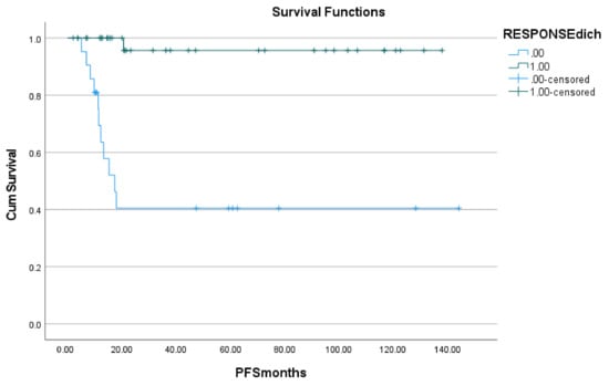 Kaplan-Meier plot of progression-free survival (PFS) in months as a function of dichotomized treatment response.