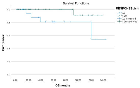 Kaplan-Meier plot of overall survival (OS) in months, as a function of dichotomized treatment response.