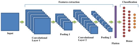Currently, CNNs have achieved state-of-the-art performance in computer vision tasks such as object recognition, image classification, and image segmentation. In these networks, the analysis of the input image proceeds through several layers of convolutional filters. The elements of the matrices that are implementing these filters are calculated during the training process, maximizing the performance of the network on the training dataset. In this adaptation lies the strength and flexibility of convolutional networks. A convolutional layer extracts those characteristic elements, called features, which are useful in the analysis process, from its input. A layer of the network implements many different convolutional filters and collects them into a so-called feature map. A convolutional layer may be followed by a pooling layer: a window of a predetermined size is scrolled along the layer output, and the values that are contained in it are replaced by their average (average pooling) or by the maximum element (max pooling). The pooling layers make the network more robust with respect to translations and reduce its output size. After the last convolutional or pooling layer, the feature maps are collected into a single one-dimensional vector of features that can be used as a unique descriptor of the content of the entire image. This vector is then used as the input of a classical, fully connected neural network that can be used for classification. The typical architecture of a CNN is showed in Figure 2.
