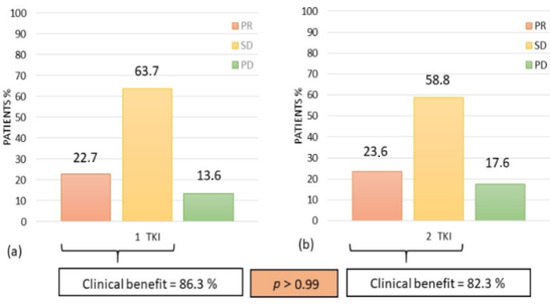 In the Study group, the BOR with the first TKI (available in 22/23 patients (95.6%)) was PR in 5/22 (22.7%), SD in 14/22 (63.7%), and PD in 3/22 (13.6%) patients. For the second TKI the BOR was analyzed only in patients who stopped the first TKI for disease progression (17/22, 77.3%), excluding from the statistical analysis patients who experienced toxicity that led to discontinuation of first TKI (n = 5). Best overall response with the second TKI was PR in 4/17(23.6%), SD in 10/17 (58.8%) and PD in 3/17 (17.6%) patients (Figure 1).