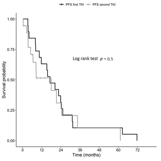 Overall, a clinical benefit was observed in 19/22 (86.3%) of patients during treatment with the first TKI and in 14/17 (82.3%) of patients according to second TKI (salvage therapy) without a significant difference between the first and second TKI (p > 0.99). These results were obtained after a median of 6.5 ± 6.4 months (range 1.6–24.8 months) with the first TKI and after a median of 3.78 ± 10.0 months (range 1.26–40.40 months) with the second TKI. In a subgroup of patients who experienced a clinical benefit (with a first-line TKI in 21/22 patients (95.4%) and with a second-line TKI in 15/17 patients (88.2%)), we evaluated the median percentage reduction of the sum of target lesions. It was 18.6% (range −58.9%–+14.5%) and 16.7% (range −44.8%–+10.8%) with the first and the second TKI, respectively without significant difference (p = 0.8). The median PFS was 17.1 months (mean 21.6 ± 4.1 months, range: 3.3–71.7 months) with first-line TKI, not significantly different (Log rank test p = 0.5) from that observed with salvage therapy (median 18 months; mean 18.8 ± 4.9 months, range: 0.36–61.2 months) in the Study group (Figure 2).