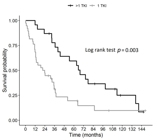 We found that more than two sites of distant metastasis (HR 2.82; 95% CI, 1.43–5.57, p = 0.003), a greater sum of the target lesions diameters (HR 1.01; 95% CI, 1.00–1.02, p = 0.012), older age at the beginning of the first TKI (HR 1.07; 95% CI, 1.05–1.1, p < 0.001) and treatment with only one TKI (HR 3.23; 95% CI, 1.5–6.60, p = 0.001), negatively affected OS.