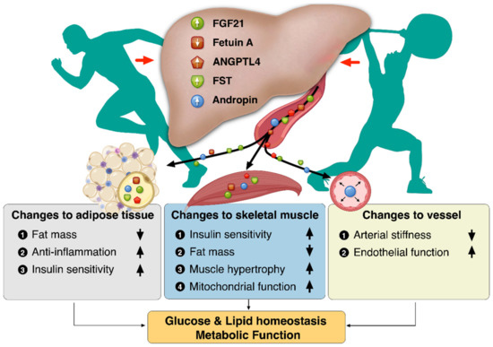 Regular exercise offers protection against chronic metabolic diseases such as NAFLD, T2D, and CVDs. Besides skeletal muscle, several tissues respond to exercise, bringing into play the issue of exercise-induced signaling molecules that could mediate this cross-talk. The liver is not merely an organ receiving humoral stimuli, but also an organ communicating with extrahepatic tissues such as adipose tissue and skeletal muscle through hepatokines. Exercise-induced hepatokines plays a role in regulating energy balance by improving insulin sensitivity, inflammation, and mitochondrial function, thereby contributing to the improvement of metabolic disorders. Exercise-induced hepatokines might also create a paradigm shift in strategies to diagnose and treat chronic metabolic diseases. Collectively, the benefits of exercise-induced hepatokines have revealed changes to the adipose tissue, vessel, and skeletal muscle for metabolic function, as depicted in Figure 1.
