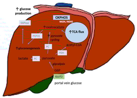 Hepatic tricarboxylic acid (TCA) flux is positively correlated with the degree of steatosis in the human liver []. By the use of stable propionate tracers and MR Spectroscopy in obese individuals with liver steatosis, the TCA cycle flux and pyruvate carboxylase flux (conversion of pyruvate to oxaloacetate) were elevated when compared with obese controls without steatosis [,]. Thus, there seems to be an increased oxidative metabolism in the steatotic liver, which leads to increased oxaloacetate-driven gluconeogenesis due to increased pyruvate cycling (the main pathway in mitochondrial anaplerosis) (Figure 1). Elevated TCA flux and pyruvate cycling has thus been speculated to function as a progenitor of the increased gluconeogenesis, which may represent an important mechanism in the elevated glucose production in NAFLD.