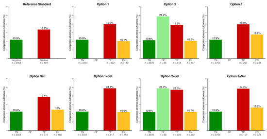 Finally, the false positive cases as compared to the true negative cases (Option 2 and Option 2-Sel only) had significantly more composite adverse outcomes. This was driven by a higher rate of LGA infants.