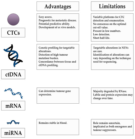 Advantages and limitations of circulating tumour marker use in the management of patients with NENs. CTCs: circulating tumour cells, ctDNA: circulating tumour DNA, mRNA: messenger RNA, miRNA: micro RNA, NENs: neuroendocrine neoplasms.