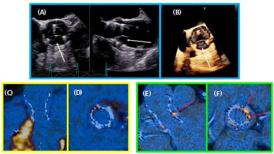 Blue frame: Transesophageal echocardiography (A) multi-D reconstruction: Acurate Neo valve with thrombotic leaflet (white arrows); (B) three dimensional reconstruction: Acurate Neo Valve with marked thrombotic leaflet (white arrow); Yellow frame: [18F]F-fluorodeoxyglucose positron emission tomography/computed tomography—no visible uptake at the level of the leaflets; (C) TAVI valve long axis, (D) TAVI valve short axis; Green frame: [18F]F-sodium fluoride positron emission tomography/computed tomography- red arrows: visible local uptakes out of the valve (aortic annulus calcifications); (E) TAVI valve long axis; (F) TAVI valve short axis.