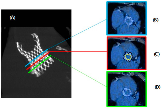 The methodology of leaflet ROI measurement in PET/CT examinations (A)—TAVI Evolut R Valve on CT—image used for estimation of leaflets localization and the choice of ROI levels. The top, middle, bottom cross-section of value used for measurements were marked with colors; Cross-sections of the valve on PET/CT examination (B)—on the top level (blue color); (C)—middle level (red color), yellow and black contour show method of inner and outer outline (ROI) for SUV measurements; (D)—bottom level (green color).
