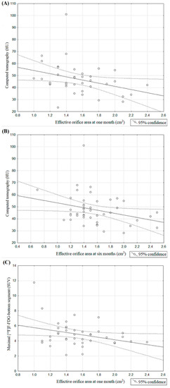 (A) Spearman’s correlation coefficient between effective orifice area at 1 month and [18F]F-fluorodeoxyglucose (HU) assessed at 6 month; (B) Spearman’s correlation coefficient between effective orifice area at 6 months and [18F]F-fluorodeoxyglucose (HU) assessed at 6 month; (C) Spearman’s correlation coefficient between effective orifice area at 1 month and maximal [18F]F-fluorodeoxyglucose assessed for bottom segment assessed at 6 months of FU period.