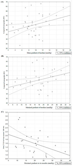 We observed a significant correlation between mean and maximal aortic valve gradient measured at baseline after the TAVI procedure and the value of Hounsfield units assessed via CT 6 months after this process (respectively: r = 0.32, p = 0.04; Figure 5A, r = 0.32, p = 0.04; Figure 5B). Additionally, significant correlations were found between maximal aortic valve gradient at 6 months and mean [18F]F-NaF uptake of the top segment corrected by mediastinal blood pool structures uptake assessed at 6 months after TAVI procedure (r = −0.4, p = 0.04, Figure 5C).