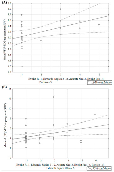 However, when considering the relationship between PET uptakes and valve types, according to our knowledge, such relationships have not been described so far in the literature. It is obvious that this may undoubtedly be a consequence of the different construction of TAVI valves, especially their scaffolding. In our publication, we showed that the smallest SUV uptakes for mean and maximal [18F]F-FDG top segments were related to the Evolut R valve, while the largest, to Sapien 3 Ultra and Portico. The results should be interpreted with caution, nevertheless, it can be concluded that the potential norms and where the SUV is measured may differ depending on valve type.