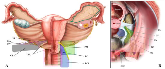 Anatomical definition of the uterosacral ligament, parametrium, paracervix, and paracolpium. (A) shows the frontal and (B) the upper view of the pelvic posterior compartment. Abbreviations: C, cervix; CL, cardinal ligament; PC, paracervix; PCl, paracolpium; PM, parametrium; PSF, presacral fascia; R, rectum; U, uterus; Ur, ureter; USL, uterosacral ligament; UtA, uterine artery; UtV, uterine vein.
