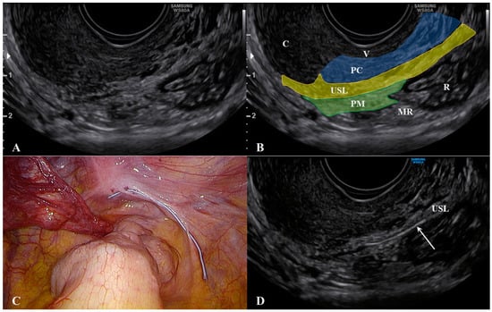 Ultrasound visualization of the uterosacral ligament, paracervix, and parametrium. Figure (A) shows the normal appearance and explanations are reported in figure (B). A polyester suture was placed on a physiological USL during laparoscopy (figure (C) and identified via ultrasound (arrow) in figure (D). Abbreviations: C, cervix; MR, mesorectum; PC, paracervix; PM, parametrium; R, rectum; USL, uterosacral ligament; V, vagina wall.