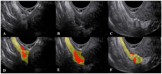 Modification of the visualization of lesions of the uterosacral ligament during the ultrasound when the probe is pushed. Figure 3 (D–F) represent the marked images respectively of figure (A–C). The uterosacral ligament is marked in yellow and lesions in red.
