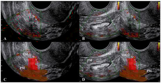 Visualization of the small vessels within the lowest part of the uterosacral ligament using color Doppler. Figure (C,D) are the marked images of figure (A,B), respectively. Endometriosis lesions of the uterosacral ligament and parametrium are in red. Abbreviations: PM, parametrium; USL, uterosacral ligament.
