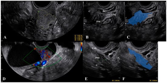 Recently, fusion imaging has gained interest for determining USL and parametrial involvement in endometriosis and cervical cancer spread [,,]. Fusion imaging, also referred to as real-time virtual sonography, displays live ultrasound imagery and previously-acquired MRI images side-by-side on a single screen. This technique requires an average of 13 min to perform [], but early work has shown that it may improve the detection rate of parametrial involvement [,]. Larger studies are required to confirm these pivotal findings. One of the main advantages of fusion imaging is the visualization of peripheral nerves (i.e., the hypogastric nerve). Peripheral nerves cannot be seen via ultrasound but are visible with an MRI; although MRI is multiplanar, it is more expensive, requires between 20 and 30 min to be completed, and does not allow a real-time evaluation. During fusion imaging, the MRI image reconstruction follows all ultrasound probe movements (real-time evaluation), making it possible to obtain oblique sections with a clear visualization of nerves [].