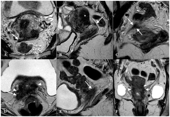 Thickened right uterosacral ligament in a woman with deep infiltrating endometriosis and adenomyosis. Axial HR T2w-Turbo Spin Echo (TSE) image (A), Sagittal HR T2w-TSE image (B), Coronal HR T2w-TSE image (C). The right uterosacral ligament shows a nodular thickening (arrows). Diffuse adenomyosis of posterior uterine wall (*). Advanced cervical cancer infiltrating right uterosacral ligament (arrow) and parametrium (arrowhead). Axial HR T2w-Turbo Spin Echo (TSE) image (D), Sagittal HR T2w-TSE image (E), Coronal HR T2w-TSE image (F).