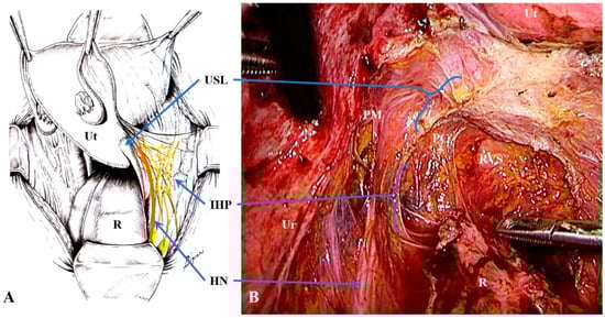 The hypogastric nerve (orange) and inferior hypogastric plexus (yellow) in an anatomical table (A); the image was modified from “Innervazione viscerale e somatica della pelvi femminile” by Ceccaroni, M, Fanfani F, Ercoli A, Scambia G; Ed. 2017, CIC Edizioni Internazionali) and surgery (B). In figure (B), the edge of the left uterosacral ligament that is close to the vagina and cervix is exposed after resection for endometriosis. Abbreviations: HN, hypogastric nerve; IHP, inferior hypogastric plexus; PC, paracervix; PM, parametrium; R, rectum; RVS, rectovaginal septum; Ur, ureter; USL, uterosacral ligament; Ut, uterus.