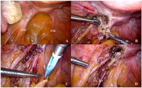 Diseases of the USL, such as endometriosis and cervical cancer, may also involve nearby structures such as the ureter, the hypogastric nerve, and the IHP (Figure 8). These diseases, therefore, require expert surgery to avoid major complications, such as ureter fistulas, voiding dysfunction, or constipation.