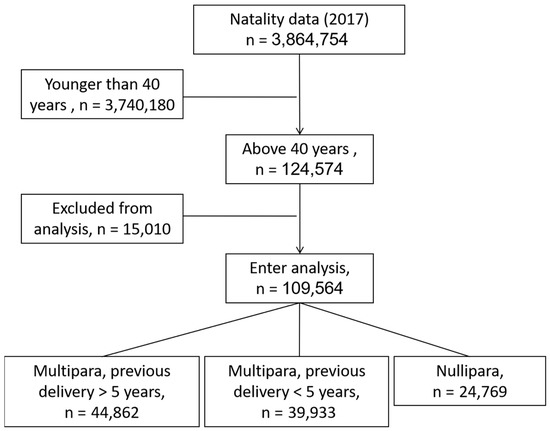 During 2017, 3,864,754 live births were recorded into the database. In 124,574 (3.2%) of them, maternal age was older than 40 years at the time of delivery. Following exclusion, 109,564 cases met the inclusion criteria and entered analysis (Figure 1).