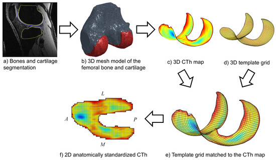 Anatomically standardized CTh maps were calculated for the femoral and tibial cartilages following a previously described procedure [12], summarized in this paragraph and illustrated for the femur in Figure 1. First, it required segmenting the bone and cartilage boundaries semi-manually on the MR images using custom software (Figure 1a), extending a previously published method limited to the segmentation of the cartilage [6]. The segmentation was performed by placing points at the bone and cartilage boundaries in order to create B-spline curves contouring these tissues [27]. Two operators segmented the MRI acquisitions independently. In order to get an estimation of the higher bound of inter-operator reproducibility, which is a safer approach to interpret the inter-operator reproducibility in the context of future studies, the two operators did not coordinate methods before segmentation [6]. Second, 3D mesh models of the femoral and tibial bone and cartilage tissues were reconstructed based on the segmentation data (Figure 1b). Third, the thickness of cartilage covering the bone was calculated, leading to 3D femoral and tibial subchondral CTh maps for each segmentation of each MRI acquisition (Figure 1c). Fourth, template grids of the subchondral bone areas (Figure 1d) were matched to the 3D femoral and tibial maps to establish anatomical correspondences based on the subchondral bone surfaces (Figure 1e). Fifth, the 3D femoral and tibial CTh maps were sampled according to the matched grids, resulting in 2D anatomically standardized CTh maps consisting of 5512 and 2063 pixels for the femur and the tibia, respectively (Figure 1f). All processing was done using custom-built software implemented in Matlab (Mathworks, Natick, MA, USA).