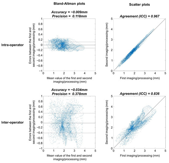 Bland-Altman (first column) and scatter (second column) plots of a typical femur for the intra-operator (first row) and inter-operator (second row) conditions. These four graphs are based on the 5512 pixels of the femoral 2D anatomically standardized map. In the Bland-Altman plots, the continuous lines represent the accuracy, while the dashed lines represent the precision. The black lines in the scatter plots correspond to the identity line.