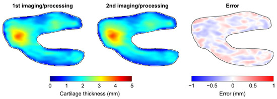 Illustration of the intra-operator reproducibility for a typical knee. This figure presents the anatomically standardized CTh map obtained with the first (left) and second (center) imaging/processing, as well as the error between the two maps (right).
