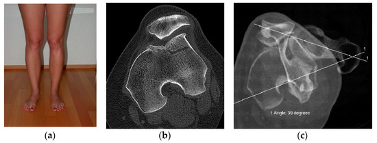 Postoperative standing examination (a) View from the front visualizing increased femoral antetorsion on the left side after deepening trochleoplasty and persisting lateral patellar subluxation; (b) axial computed tomography showing the situation after deepening trochleoplasty with persisting lateral patella subluxation (the same patient as in Figure 3a); (c) Rotational study with computed tomography showing increased femoral antetorsion of 39° (the same patient as in Figure 3a,b).