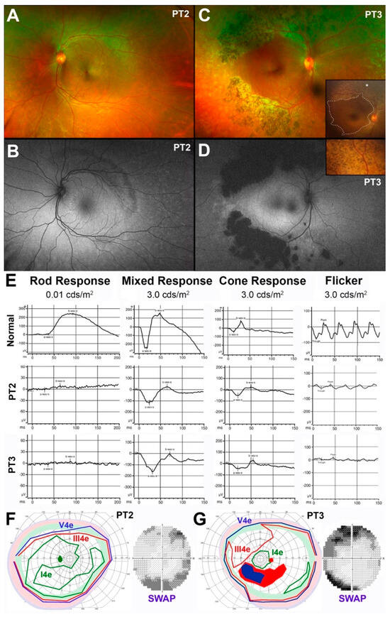 - Cassiman, C.; Spileers, W.; De Baere, E.; De Ravel, T.; Casteels, I. Peculiar fundus abnormalities and pathognomonic electrophysiological findings in a 14-month-old boy with NR2E3 mutations. Ophthalmic Genet. 2013, 34, 105–108. [Google Scholar] [CrossRef] [PubMed]