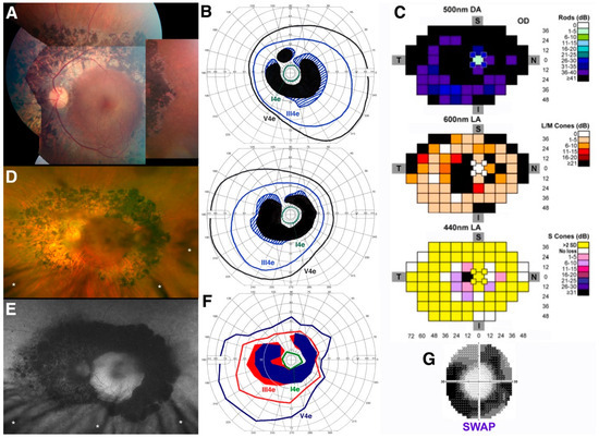 - Blanco-Kelly, F.; García Hoyos, M.; Lopez Martinez, M.A.; Lopez-Molina, M.I.; Riveiro-Alvarez, R.; Fernandez-San Jose, P.; Avila-Fernandez, A.; Corton, M.; Millan, J.M.; García Sandoval, B.; et al. Dominant retinitis pigmentosa, p.Gly56Arg mutation in NR2E3: Phenotype in a large cohort of 24 cases. PLoS ONE 2016, 11, e0149473. [Google Scholar] [CrossRef]