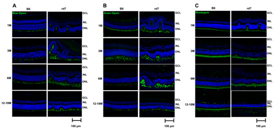- Haider, N.B.; Naggert, J.K.; Nishina, P.M. Excess cone cell proliferation due to lack of a functional NR2E3 causes retinal dysplasia and degeneration in rd7/rd7 mice. Hum. Mol. Genet. 2001, 10, 1619–1626. [Google Scholar] [CrossRef]