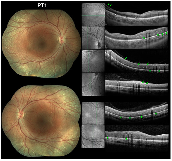 - Kremlikova Pourova, R.; Paderova, J.; Copikova, J.; Kousal, B.; Dudakova, L.; Liskova, P. SD-OCT imaging as a valuable tool to support molecular genetic diagnostics of Usher syndrome type 1. J. AAPOS 2018, 22, 312–314.e3. [Google Scholar] [CrossRef]